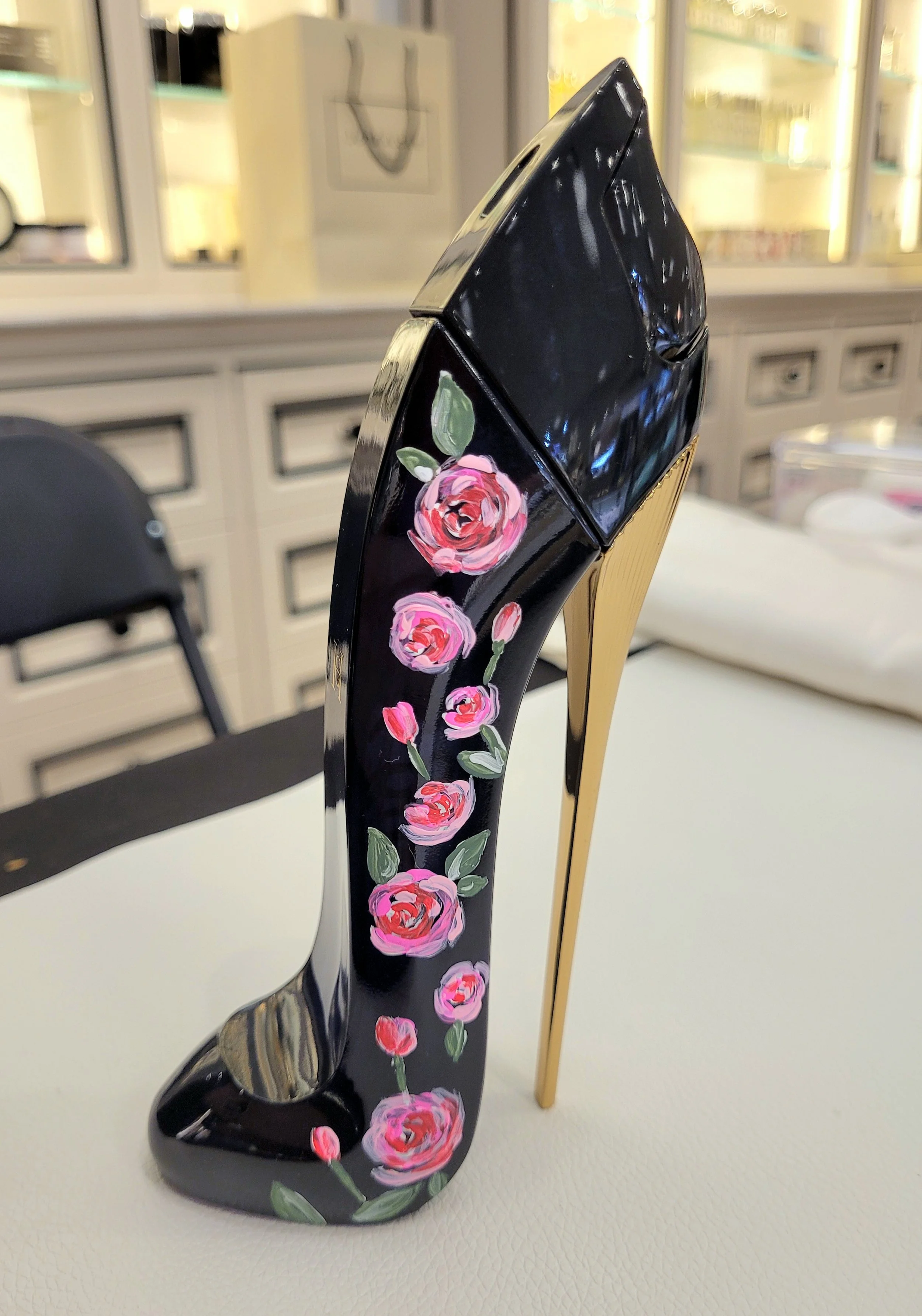 Bottle painting adds a splash of color and personality to perfume bottles, compacts, drinking glasses, and more. Customers love to stop and watch me at work, and I’m more than happy to entertain them!